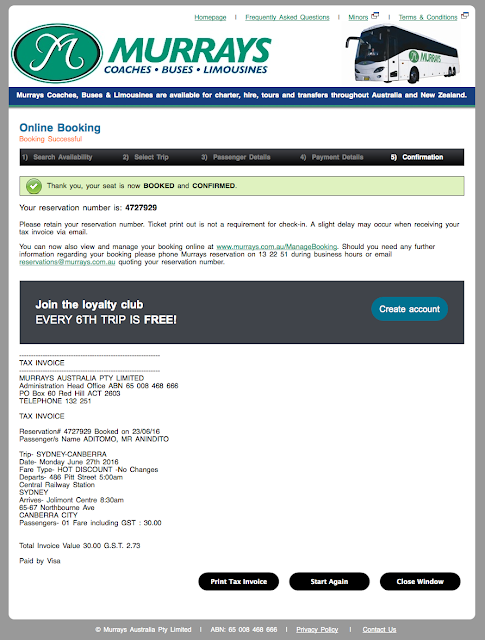 Karena itu, untuk kali ini, naik bus adalah pilihan terbaik untuk si Ayah. Saya segera mengecek website Murrays, perusahaan bus terkemuka di Sydney. Di website-nya, kita bisa langsung memesan tiket sesuai jadwal yang tersedia setiap jam. Bayarnya pakai kartu kredit. Waktu saya pesankan, ada tiket diskon seharga $30 untuk jadwal di pagi hari. Tentu saya nggak mau kehabisan!